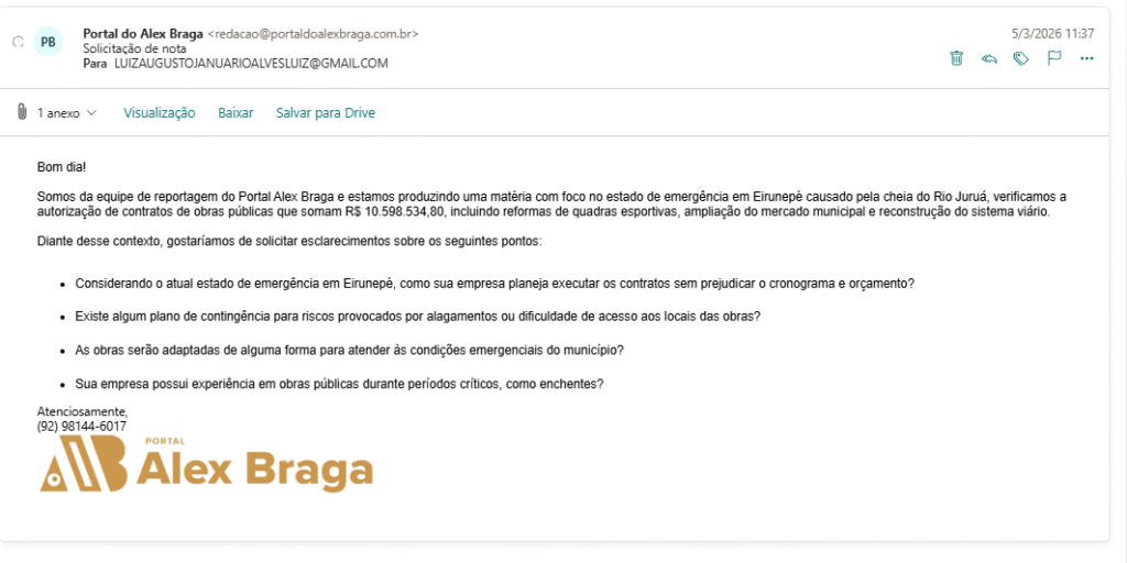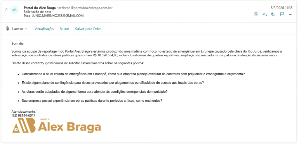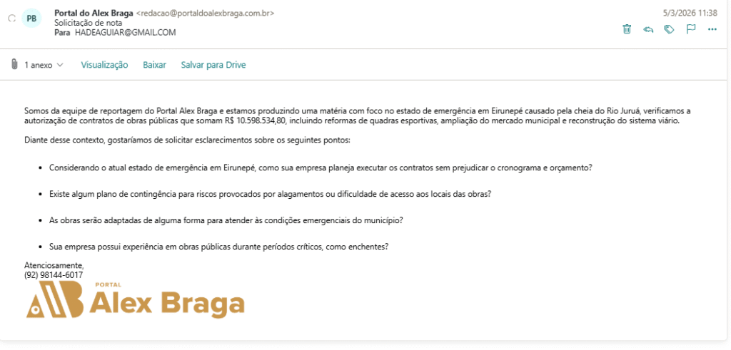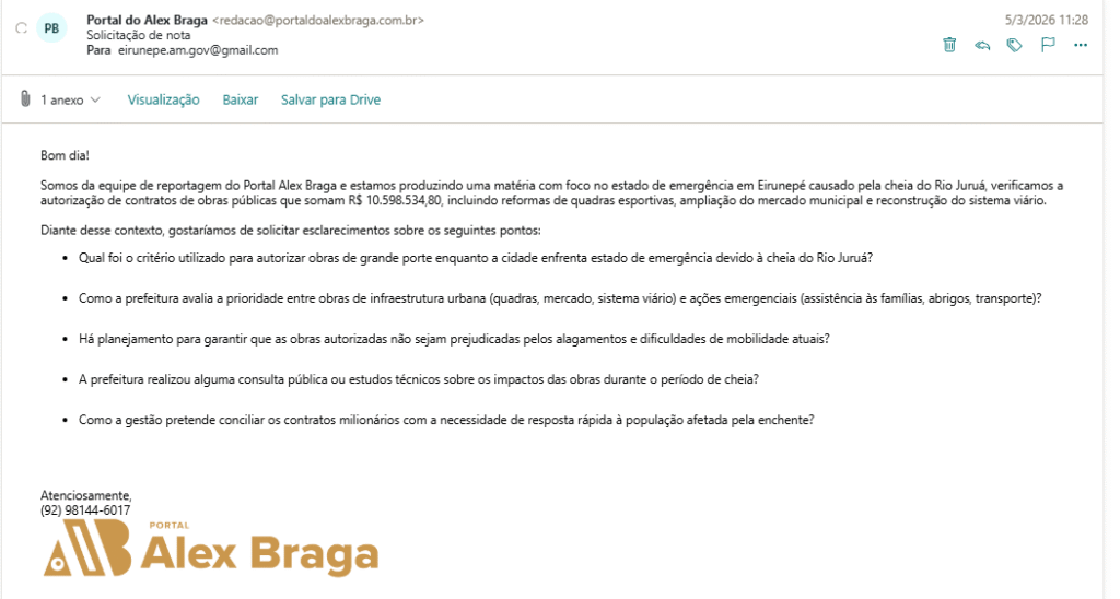 O Núcleo de Reportagem Investigativa do Portal Alex Braga entrou em contato com a prefeitura de Eirunepé para falar sobre o caso, mas até a publicação desta matéria não obtivemos respostas. O espaço segue aberto para esclarecimentos.