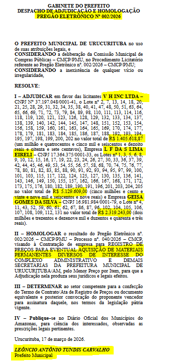 O prefeito Leôncio Tundis (PT), irá realizar uma revolução em Urucurituba. Segundo a Ata de Registro de Preço n° 002/2026 o prefeito vai torra R$ 8,8 milhões em 205 itens que vão desde coletes salva-vidas, massageador corporal e facial, esteiras, balança digital, funil de plástico, jarra, tatame, beliche, colchões, ar-condicionados e outros diversos itens.