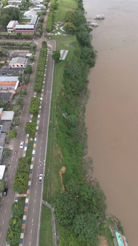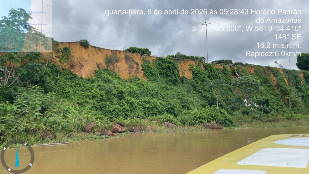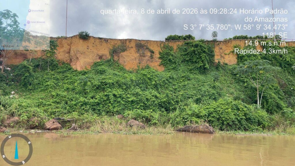 O documento aponta risco de colapso da orla, com encostas em ângulo acentuado e avanço acelerado da erosão devido à variação do nível do rio. Um evento registrado em 31 de março teria provocado o desabamento de cerca de 50 metros de solo, levando à interdição da área.