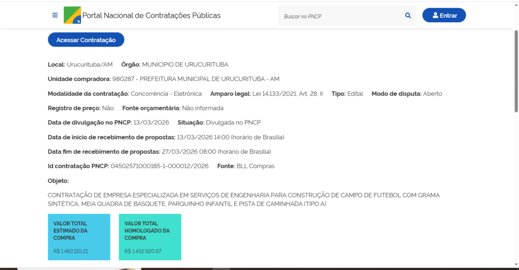 A contratação foi realizada com base na Lei nº 14.133/2021, com sessão realizada em 27 de março de 2026 na plataforma da Bolsa de Licitações e Leilões (BLL).