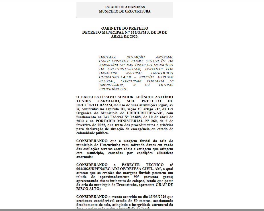 Em 10 de abril de 2026, o prefeito assinou o Decreto Municipal nº 335/GPMU, que declara situação de emergência por 180 dias em áreas afetadas pela erosão da margem fluvial.