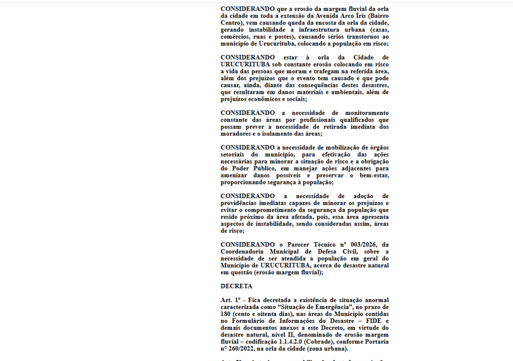 Dias após a homologação da obra e da formalização de despesas culturais, o prefeito assinou decreto reconhecendo situação de emergência na orla do município, onde a erosão fluvial teria provocado desabamento de trechos da margem e colocado moradores e estruturas públicas em risco.