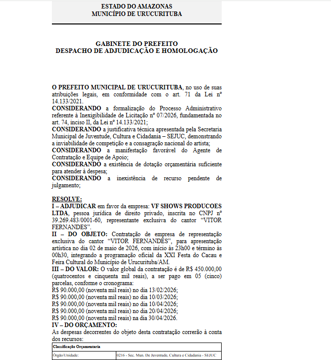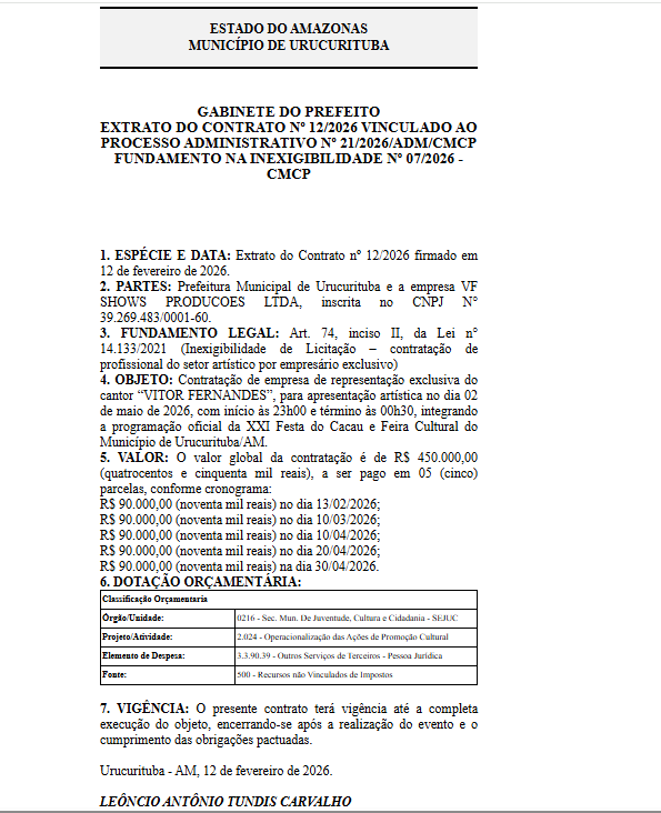 Além da obra, a gestão municipal também firmou o Contrato nº 12/2026, no valor de R$ 450.000,00, para apresentação artística durante a XXI Festa do Cacau e Feira Cultural do Município de Urucurituba.