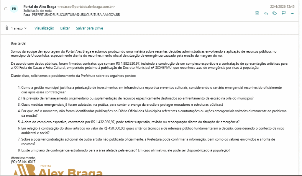 A Prefeitura de Urucurituba, sob gestão do prefeito Leôncio Antônio Tundis Carvalho (PT), movimentou ao menos R$ 1.882.920,97 em contratos públicos envolvendo a construção de um complexo esportivo e a contratação de show artístico para a XXI Festa do Cacau e Feira Cultural, mesmo após reconhecer oficialmente situação de emergência causada pela erosão da margem do rio no município.