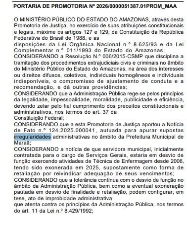 O MPAM determinou o prazo de 10 dias para que a prefeitura se manifeste sobre o caso, devendo encaminhar: cópia integral da ficha funcional e financeira da servidora; cópia dos atos de nomeação/contratação e de exoneração, com a devida motivação legal e administrativa para o desligamento ocorrido em 2025; além de esclarecimentos detalhados sobre as funções efetivamente desempenhadas pela servidora.