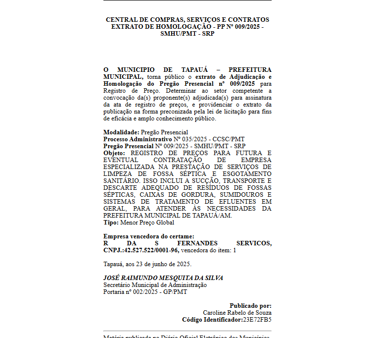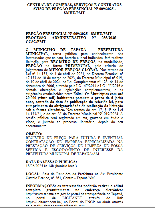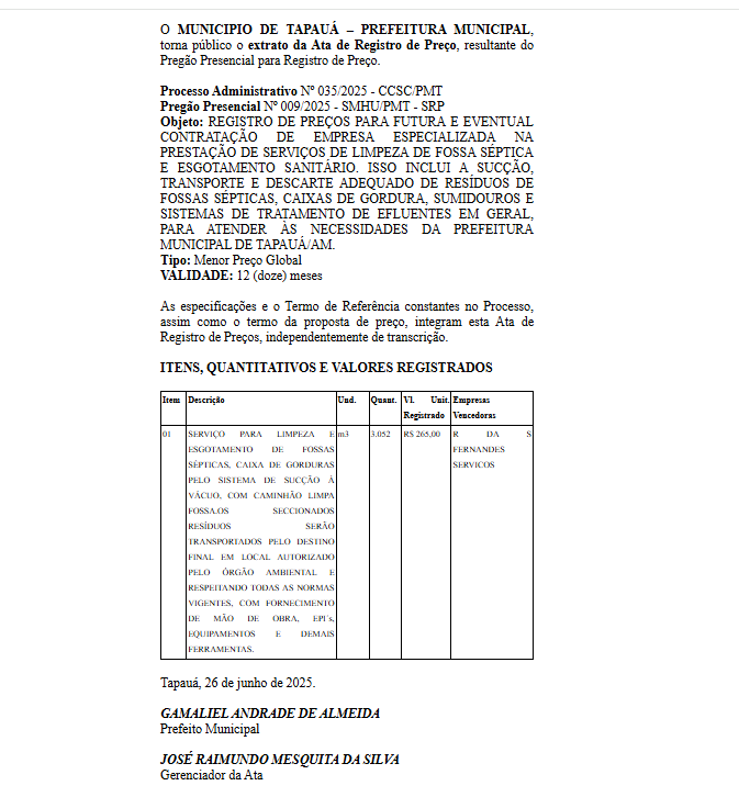 O extrato de contrato e a ata de registro de preços referentes ao Pregão Presencial nº 009/2025 da Prefeitura de Tapauá indicam que a empresa deveria atuar por 12 meses no serviço de limpeza e esgotamento de fossas, com responsabilidade sobre o transporte e destinação final dos resíduos, conforme normas ambientais vigentes.