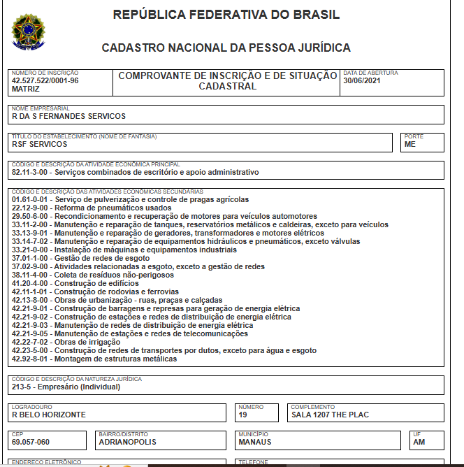 A R DA S Fernandes Serviços, com CNPJ 42.527.522/0001-96, tem sede em Manaus, no bairro Adrianópolis, e está cadastrada no segmento de serviços combinados de escritório e apoio administrativo (CNAE 82.11-3-00). O capital social da empresa é de R$ 200 mil.