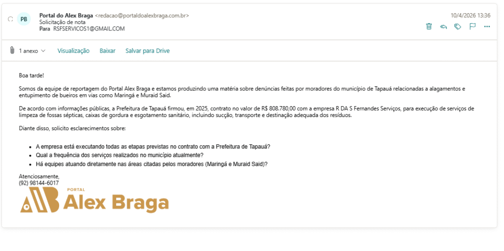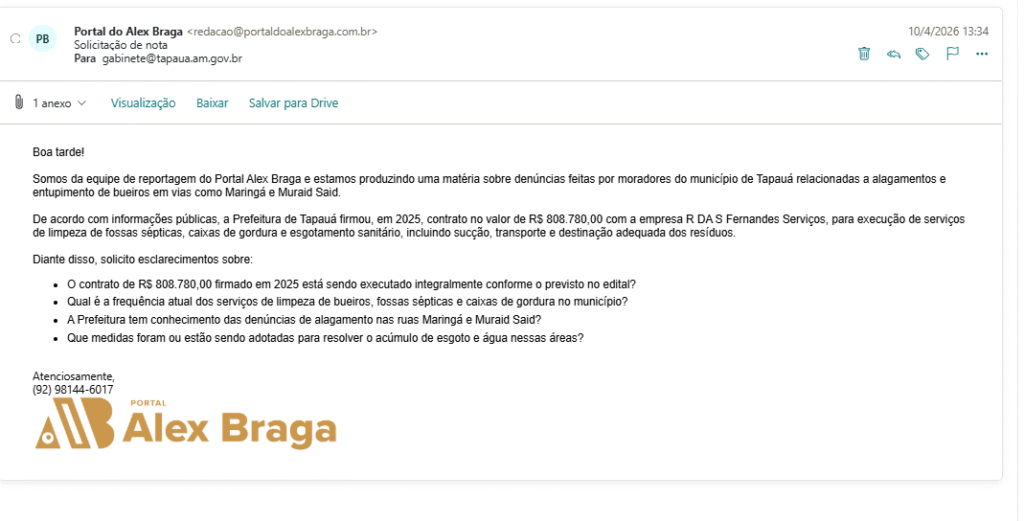 Moradores do município de Tapauá denunciam que ruas como Maringá e Muraid Said seguem alagadas e com bueiros entupidos, mesmo após a Prefeitura firmar, em 2025, um contrato de R$ 808.780,00 com a empresa R DA S Fernandes Serviços para limpeza de fossas sépticas, caixas de gordura e esgotamento sanitário.