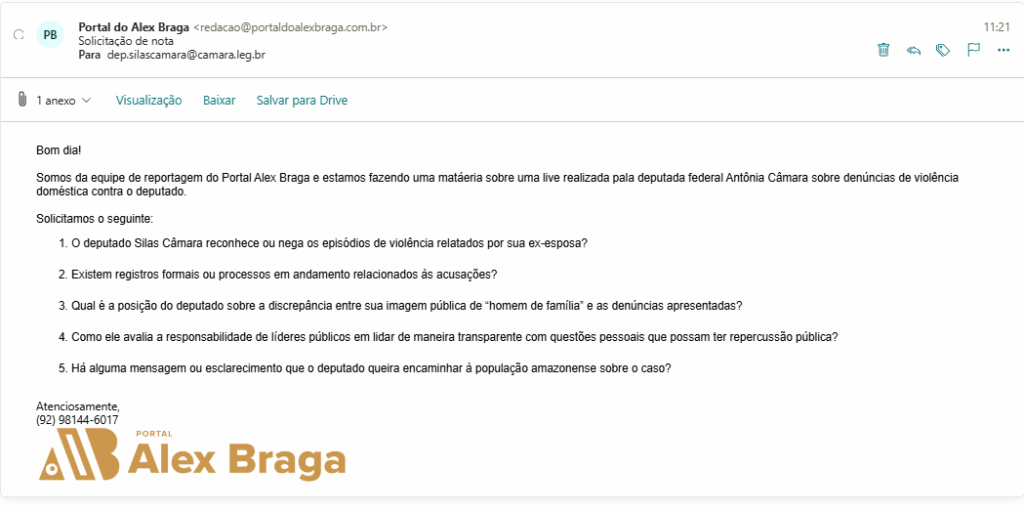 O Portal Alex Braga entrou em contato com o deputado federal Silas Câmara para falar sobre as acusações feitas por sua ex-esposa, mas até a publicação desta matéria não houve manifestação oficial. O espaço segue aberto para esclarecimentos.